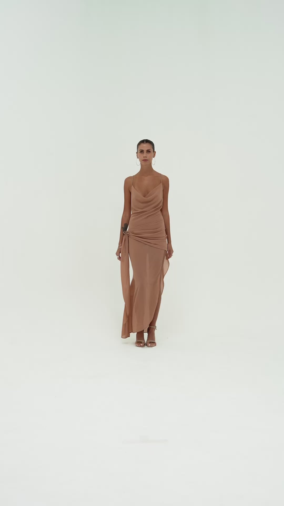 Designed in Bali. The Luna Dress offers a captivating blend of style and sensuality. Designed with a scoop cowl neckline and an open back with cross strap detailing, the thigh-high side slit and semi-sheer, maxi-length design create a striking silhouette, perfect for evening allure and beachside elegance.